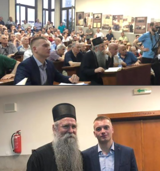 On picture is archbishop of Serbian Ortodox Joanikije Church with the leader of one Student Organization – Student’s Club of Faculty of Law on one on several events organized with topic about endangerment of Serbian Church and identity in Montenego