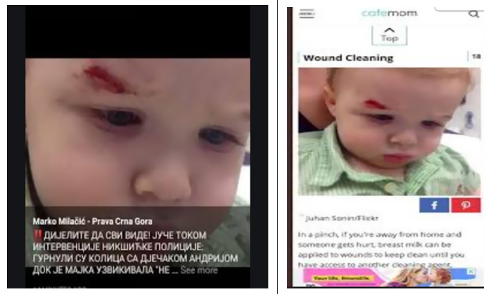 On left side we can see twit from opposition leader in Montenegro Marko Milacic, where is made statement that police crushed a baby, and on right side we see that picture is from medical advertisement.