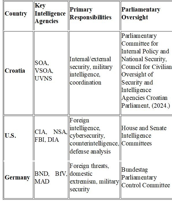 To highlight institutional distinctions, the next table compares the intelligence systems of Croatia, the United States, and Germany in terms of structure, function, and oversight.
