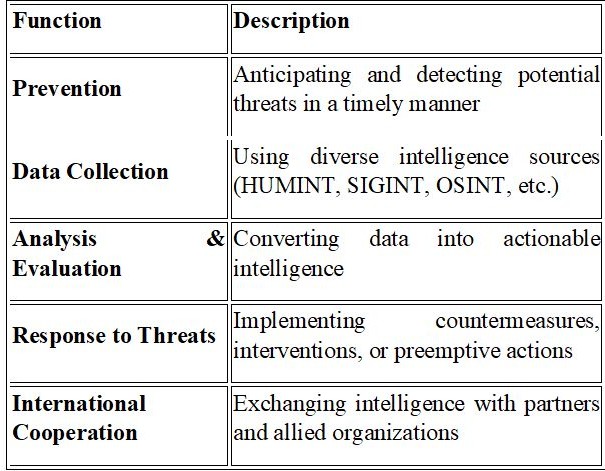 Key functions of intelligence strategies are presented in table 5 comparing roles of each function in intelligence processing. To remain effective, strategies must be flexible and forward-looking, ensuring the intelligence system remains both robust and adaptable to unforeseen developments.