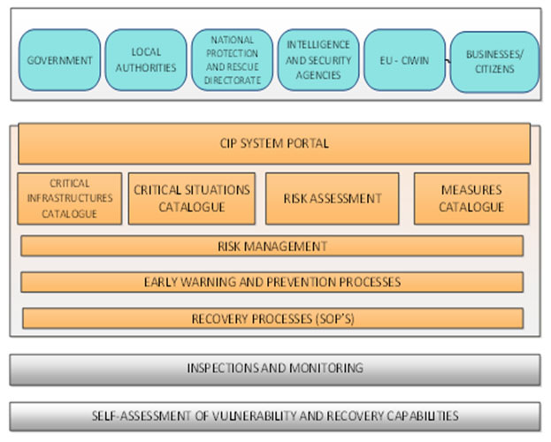Such system is multilayered and should encompass all the stakeholders with respective roles. In the Figure above, elements from the Croatian regulatory framework where taken into account, with a specific competency of the National Protection and Rescue Directorate. Such system should be integrated with the EU CIWIN (Critical Infrastructure Warning Information Network) in real time or for NON-EU countries respective regional alliance network. Interoperability is assumed through all of the functions and process management system components, as well as with shared inspections. The concept of catalogues would allow intelligent controls through the system. Several main groups of process driven systems cover respective events/situations that are managed.