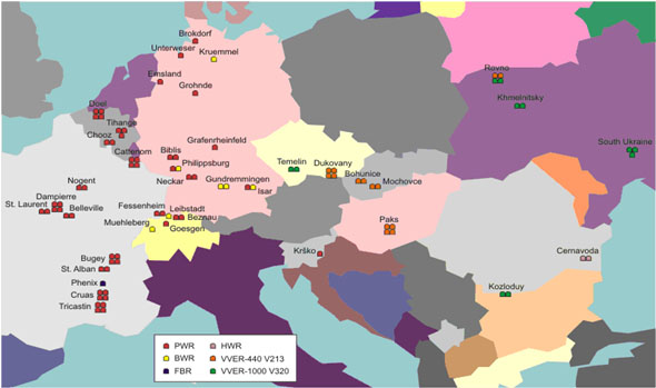 The closest nuclear power plants (NPP) are located in Slovenia NPP Krško (10.6 km from the Croatian state border) and NPP Pakš in Hungary (74.1 km).Within 1.000 km from the Croatian national territory, that is, from its biggest population-centers (Zagreb, Osijek, Split, Rijeka) there are 40 operational nuclear power plants (NPPs) containing 89 power reactors (1 to 4 reactor units per plant). Reactors differ in power, age and technology.Locations of nuclear power plants over a distance of 1000 km from Croatiashown in Figure 8.NPP are potential threat to the City of Zagreb, depending on the degree of possible accident and meteorological conditions during its events.All technical installations, including NPP, generate certain risks. The biggest risks associated with nuclear power plants are in uncontrolled release of large quantities of radioactive substances into the environment. In order to prevent the occurrence of failures that lead to the uncontrolled release of radioactivity into the environment,the implementation of the principle of defense in depth ("defense in depth in nuclear power stations") which consists of introducing a number of active and passive barrier between the radioactive substance accommodated in the reactor core and the environment, is being done in NPP. Nevertheless, there is a little possibility of such a chain of events that would lead to the release of large quantities of radioactive substances into the environment.
