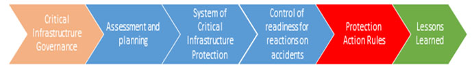 From the methodology point of view, to present a model for CIP from the national/state perspective we shall take into account two main situational statuses: pre-accident (Figure 1 – blue) and post-accident (Figure 1 – red) with hazardous impact to the critical infrastructure.