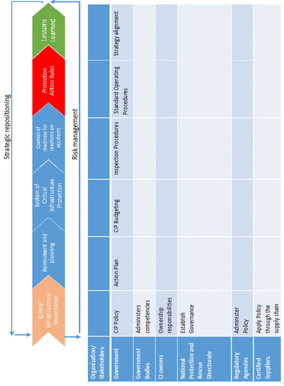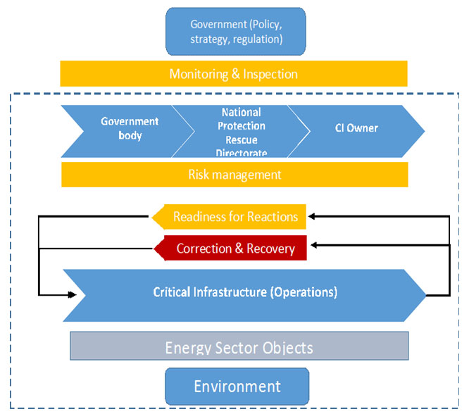 From the methodology point of view, to present a model for CIP from the national/state perspective we shall take into account two main situational statuses: pre-accident (Figure 1 – blue) and post-accident (Figure 1 – red) with hazardous impact to the critical infrastructure.