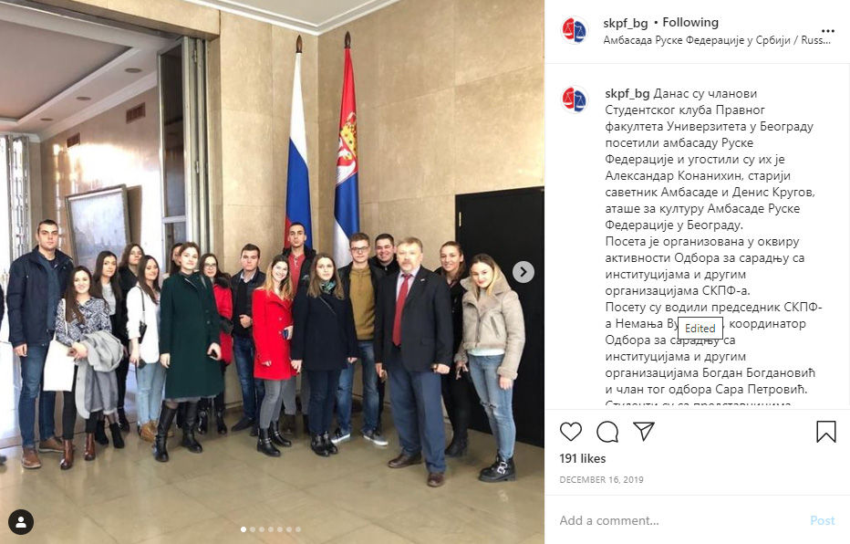 Student Organization – Student’s Club of Faculty of Law in one of numerous visits to Russian Federation in Belgrade, with diplomat Aleksandar Konanihin on picture