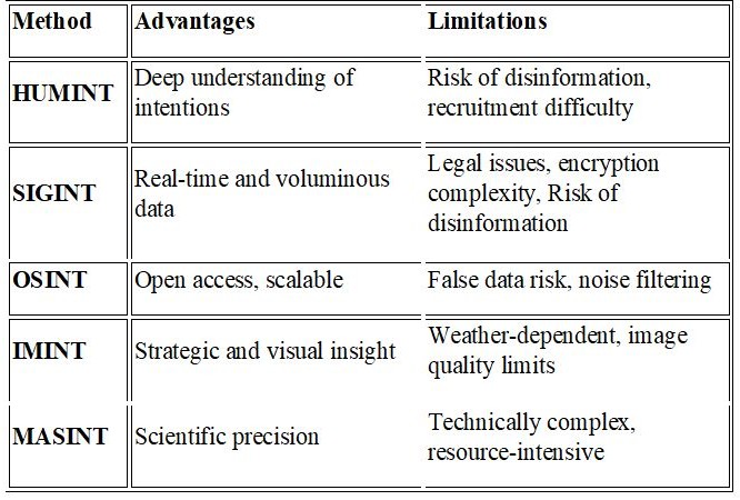 Effective intelligence work depends on the appropriate integration of multiple data collection disciplines. Each method offers distinct advantages and limitations in operational scope and reliability: