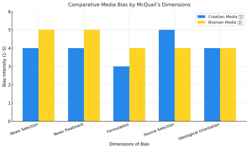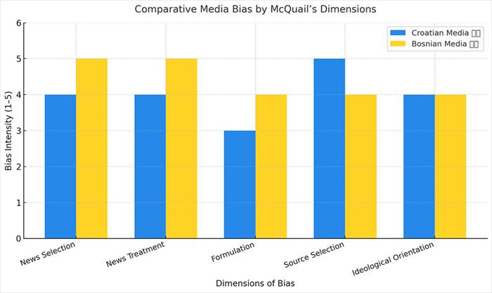 The ideological framework shapes all other dimensions of bias and confirms the divided narrative in BiH. The bias diagram shows the intensity of bias (from 1 to 5) according to McQuail's dimensions for Croatian and Bosniak media.