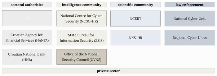 The Croatian cybersecurity ecosystem functions as an operational tandem between the National Cybersecurity Centre of Croatia (NCSC-HR) and the National Computer Emergency Response Team (NCERT), representing the intelligence and scientific communities, respectively (Cybersecurity Act, 2024; Interview X). These bodies operate in parallel to the law enforcement system, with digital evidence handling and the criminal justice process treated as a separate domain. Complementary institutions include the Office of the National Security Council (UVNS), which plays a strategic role in developing national policy and cybersecurity strategy, the State Information Security Bureau (ZSIS), responsible for cybersecurity certification, and the National Coordination Center for Industry, Technology and Research in the Field of Cybersecurity (NKS-HR) (Interview X). Sectoral authorities also play a supplementary role in overseeing cybersecurity in specific critical sectors (Interview X). The private sector is actively engaged within the ecosystem; however, public-private partnerships are fragmented and not always formally recognized (Interview X). Overall, the system is characterized by informal ties (Interview X), which help maintain functional connections across organizational boundaries. A summarizing overview of the key actors can be found in Figure 1.